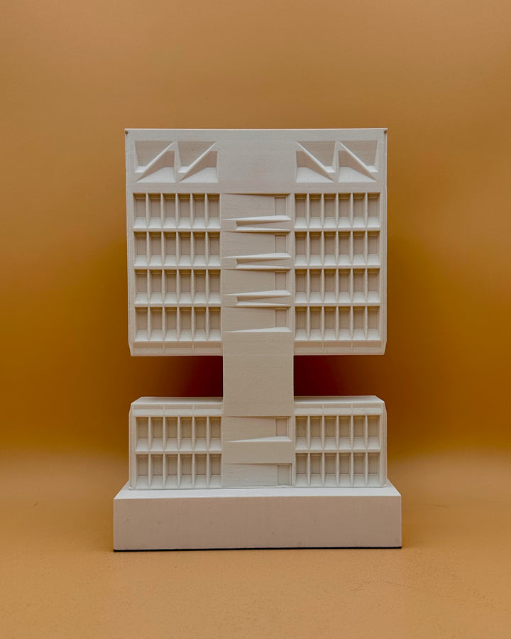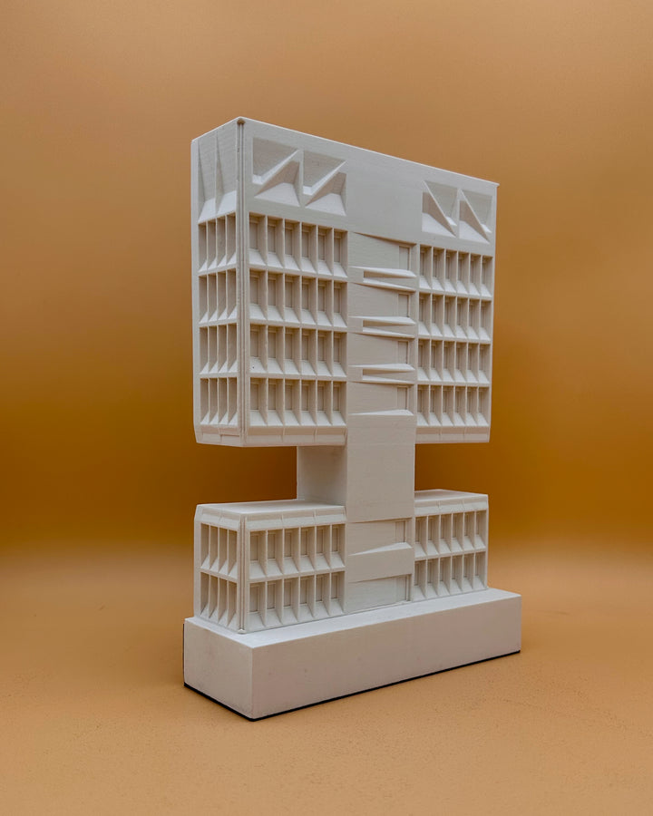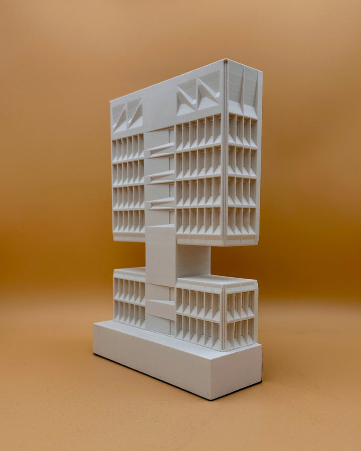 The Pirelli Tire Building (now known as Hotel Marcel) in New Haven, Connecticut, designed by Marcel Breuer and completed in 1970, is a striking example of Brutalist architecture. Known for its bold, monolithic form, the building features a massive concrete superstructure with a distinctive inverted "ziggurat" shape, where upper floors cantilever over the base. Breuer’s design emphasises raw, unadorned concrete (a hallmark of Brutalism) and geometric rigor, creating a powerful, fortress-like presence. The building’s heavy, sculptural massing contrasts with the surrounding low-rise urban fabric, making it a controversial yet iconic landmark. Its deep recessed windows and textured concrete surfaces play with light and shadow, enhancing its dramatic effect while serving functional needs for office spaces.